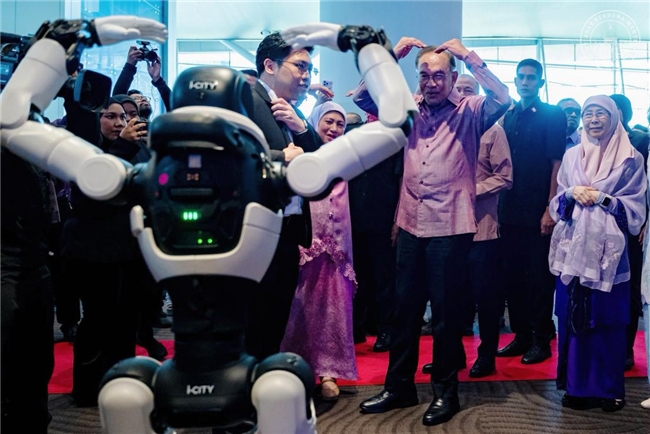 安瓦尔总理“比手画脚”地与机器人交流,这一逗趣的瞬间引得身后的夫人旺阿兹莎和妇女部副部长林慧英忍俊不禁,成为庆典上的温馨亮点,生动诠释了具身智能技术在公共服务与人文交流中的亲和力。