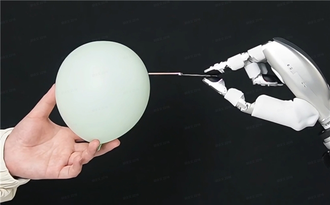 在发布会的大屏幕上,一段视频将GF515的能力具体而生动的呈现出来。一只搭载GF515的灵巧手捏起一根极细的针,缓缓戳向一只饱满的气球——针尖触及球面的瞬间,气球微微凹陷,却始终没有破裂。高灵敏度的多维力让仿生手指的力度掌握得刚好:再轻一分无法感知接触,再重一分气球应声而破。
